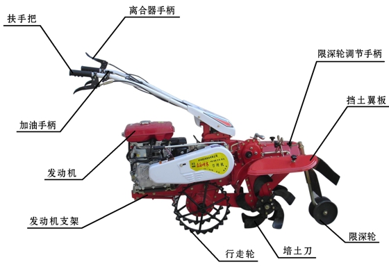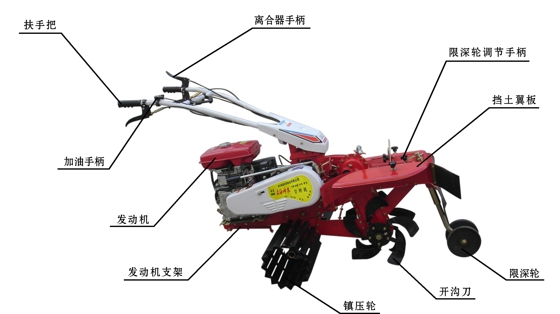 該機(jī)設(shè)計(jì)合理,結(jié)構(gòu)緊湊,配有轉(zhuǎn)向離合器,扶手把高度4檔調(diào)整,左右360度任意旋轉(zhuǎn),操作舒適方便,作業(yè)部件插銷連接,換裝方便快捷。主要用于大姜、大蔥、土豆等經(jīng)濟(jì)作物種植開(kāi)溝、培土和溫室大棚種植瓜果、蔬菜等作物旋耕、開(kāi)溝等。
